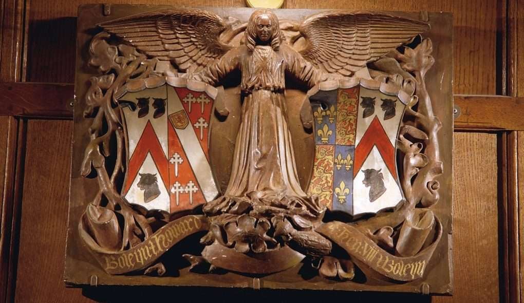 Located in the Books of Hours Room is the coats of arms of Boleyn/Howard and Henry VIII/Boleyn. It is one of the artefacts that has been on display in the Castle for the longest – since the ownership of the second Jane Waldo in the 19th century. It was mentioned in issue 405 of the Penny Magazine, 28th July 1838: